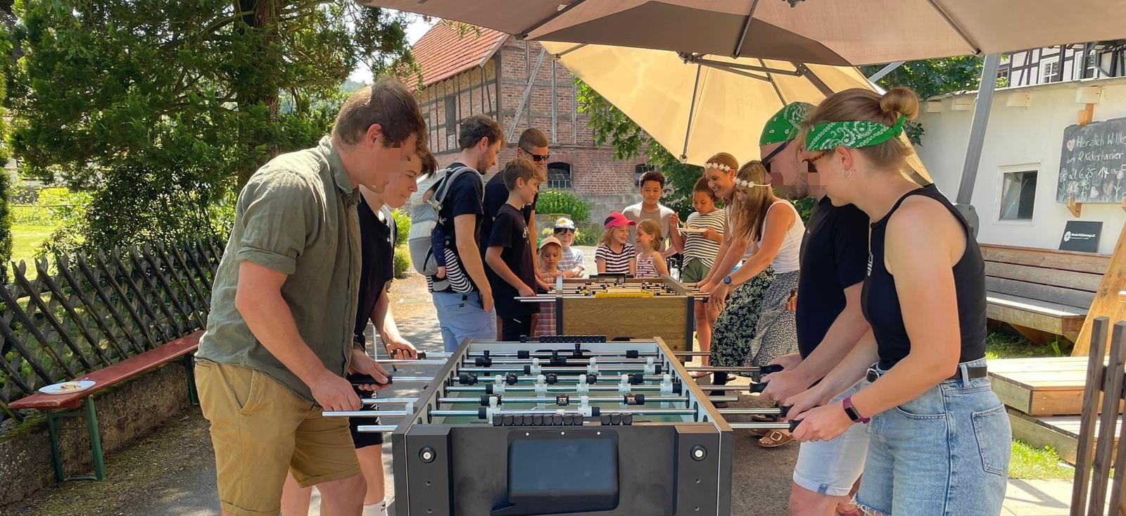 Bei absolut wunderbarem Wetter konnten wir am Samstag den Kampf um den Mühlenspitzpott mit unserem Kickerturnier austragen. Der Startschuss fiel mit dem Genuss des Burgeressens - sehr sehr lecker! Und dann ging es los: 12 Teams kickerten sich über etliche Runden um den Verstand! Gewonnen haben schlussendlich die Bornberg Kickers. Sie konnten den Wanderpokal mit Heim nehmen. Aber da der Pokal ja wandern muss und es wirklich eine tolle Gemeinschaftsaktion war - freuen wir uns schon jetzt auf das nächste Kickerturnier am Mühlenspitz!